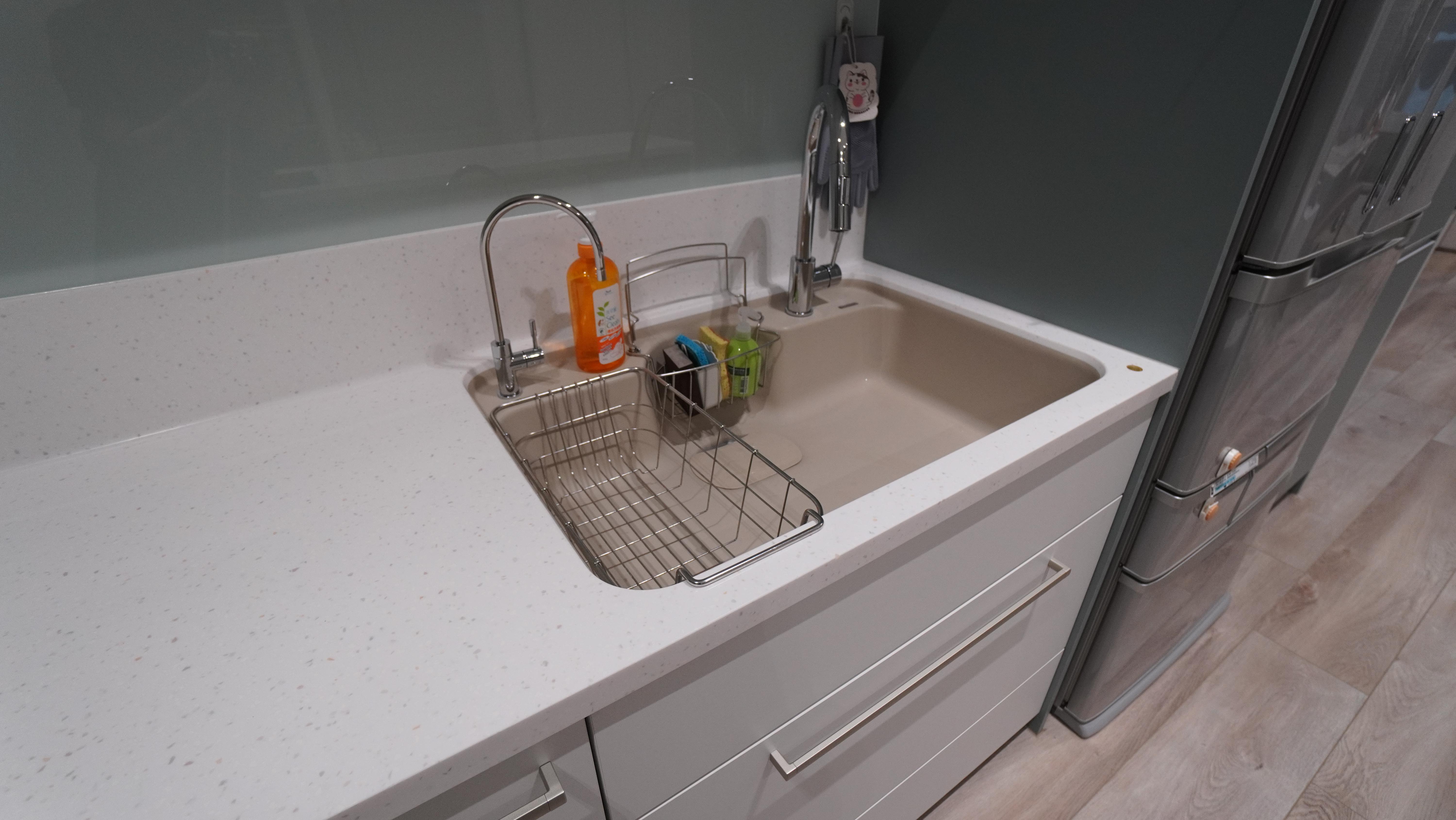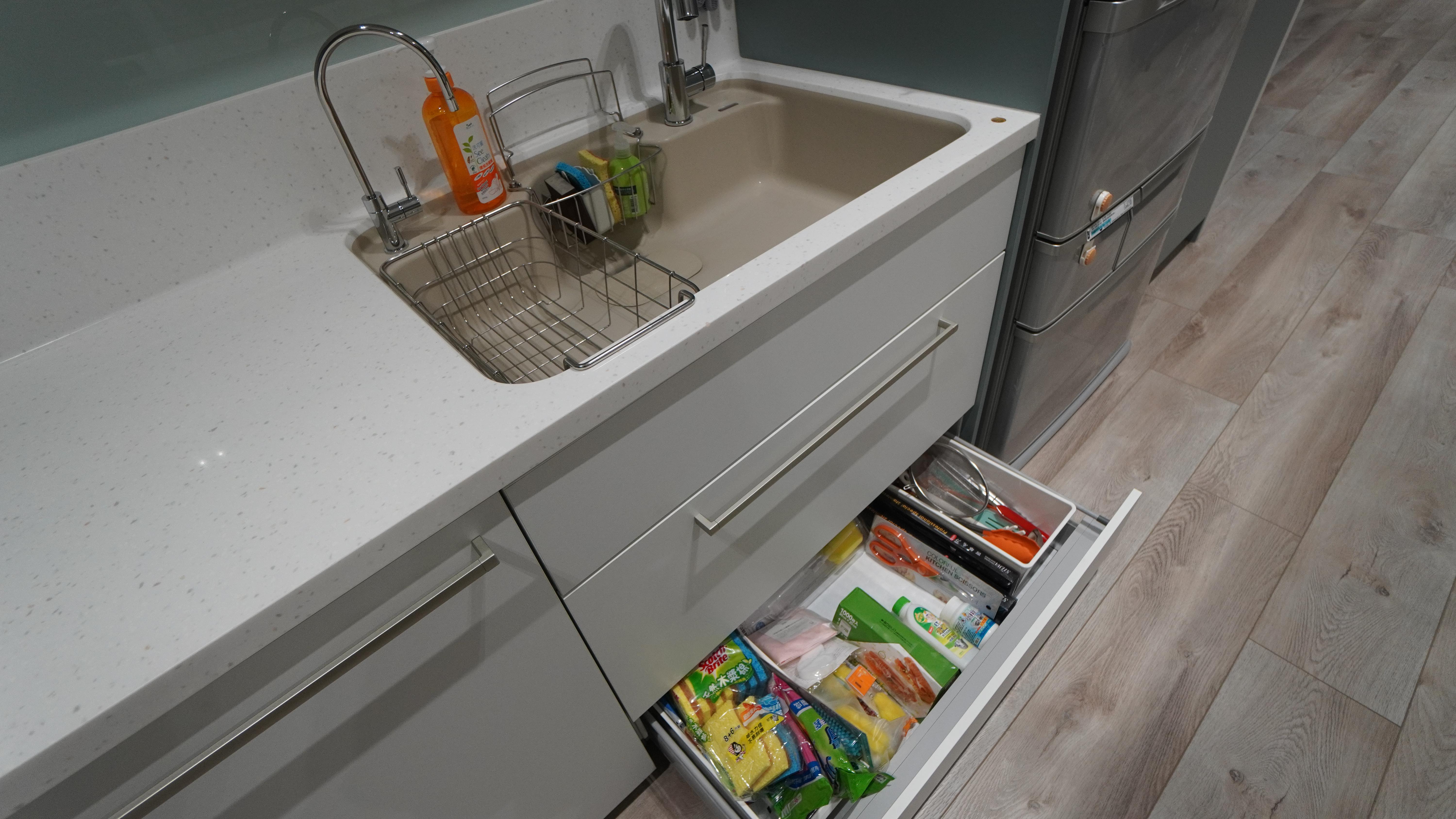 就連 #H2人造石水槽 下方,也藏著隱藏式儲物空間。